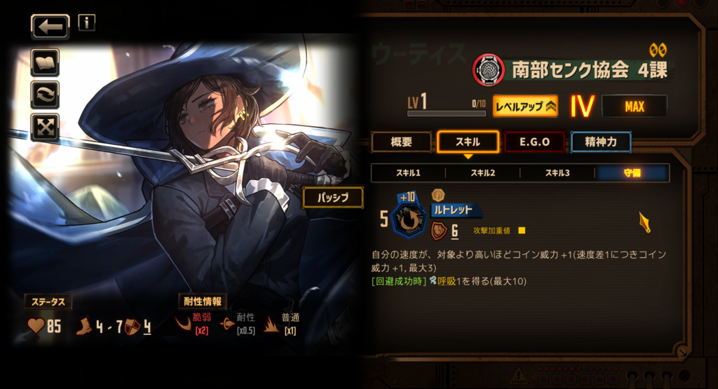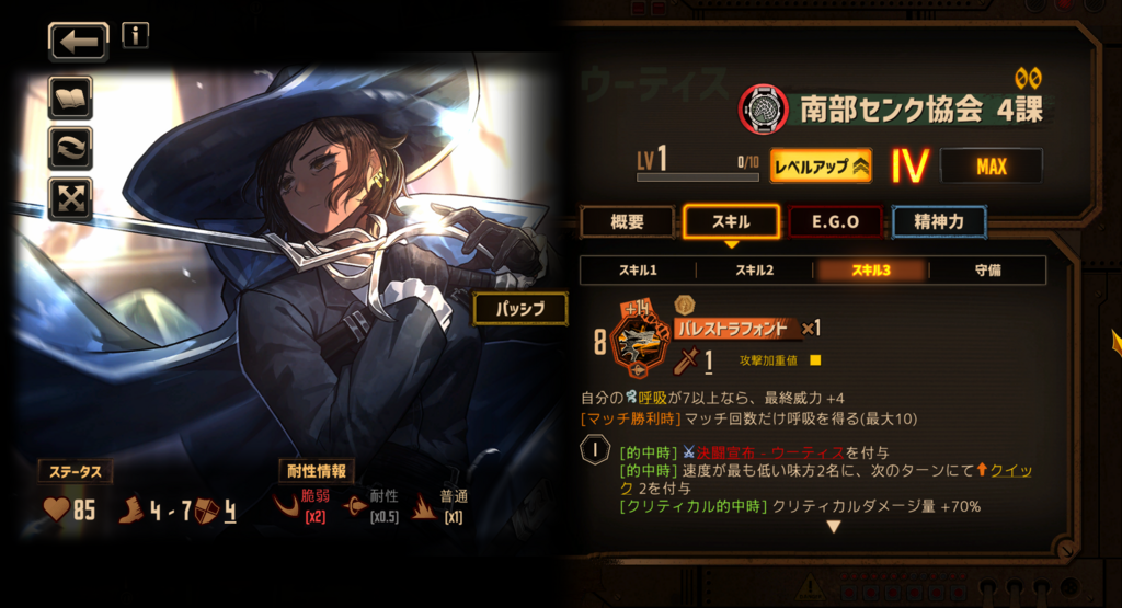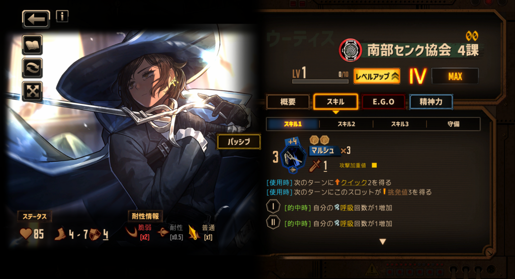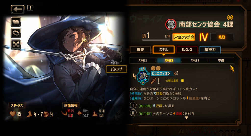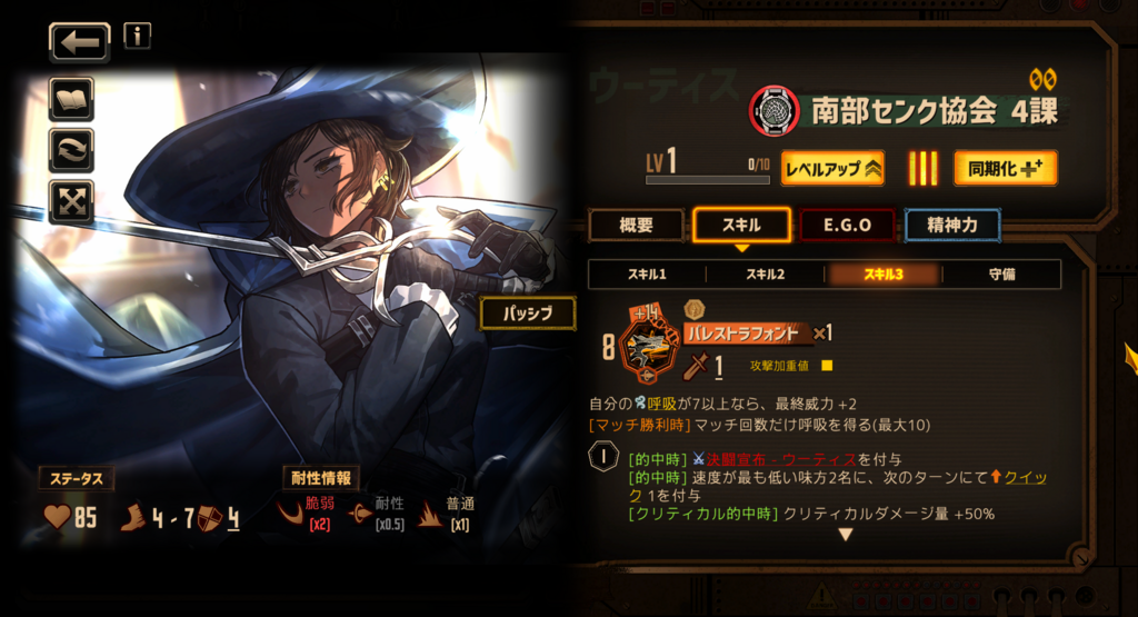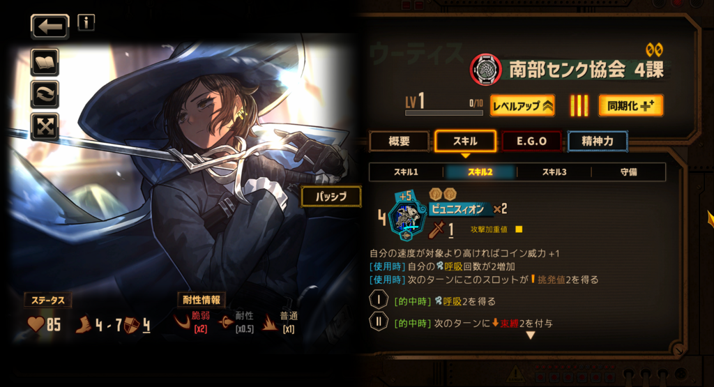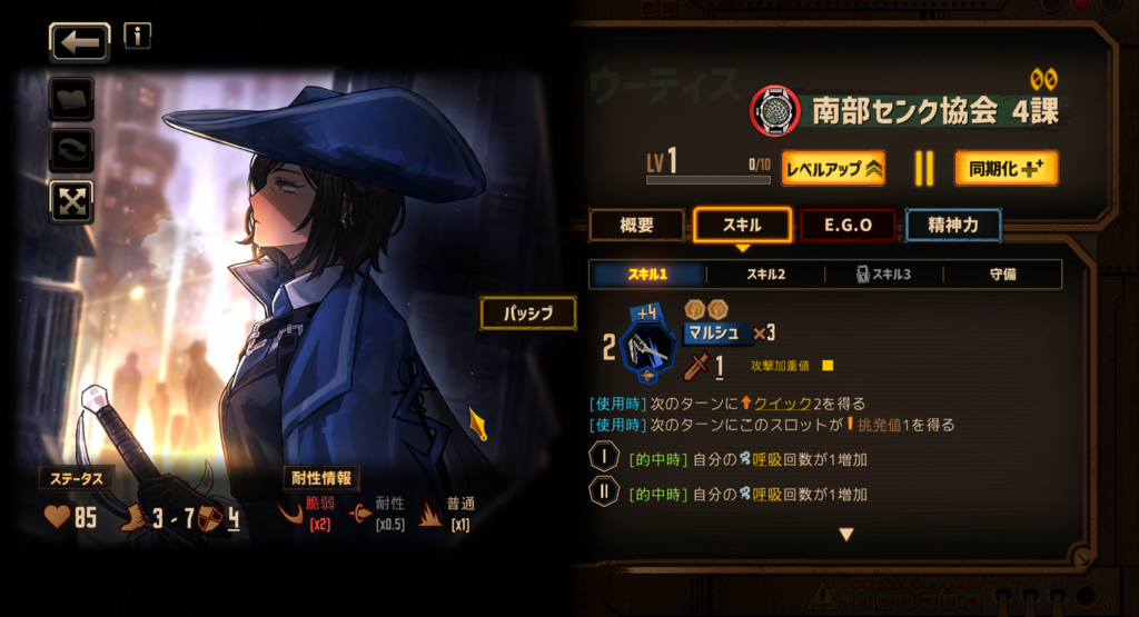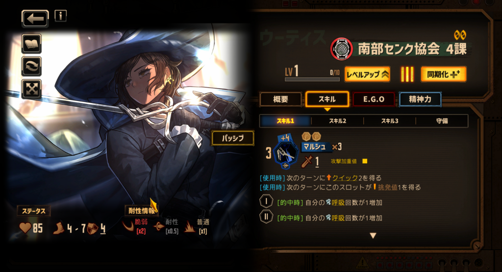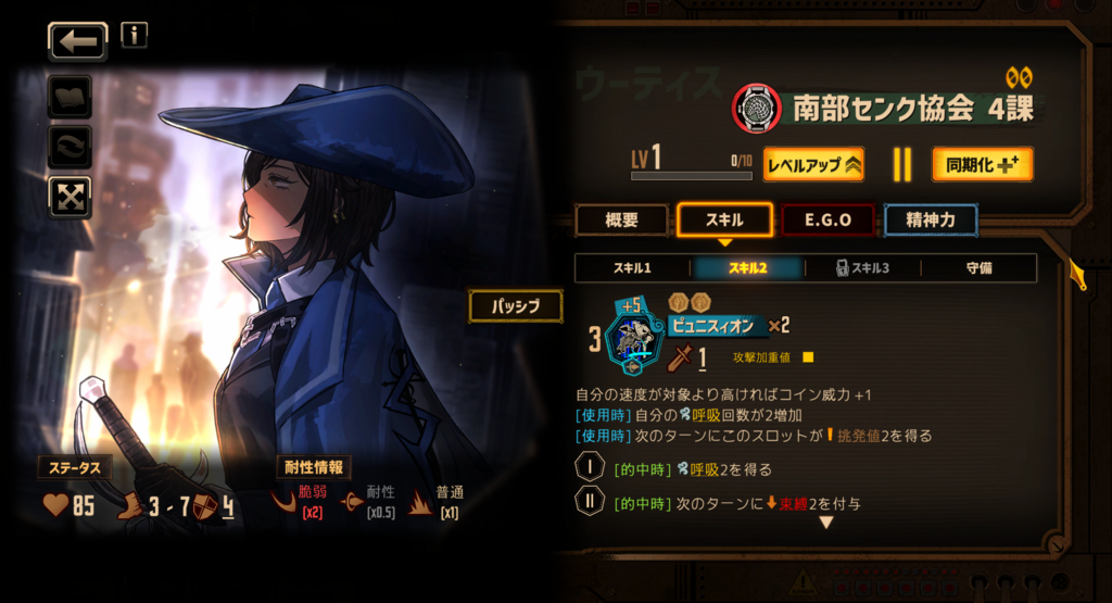 呼吸人格でもあり、s1・s2で呼吸回数を稼げるほか回避成功で呼吸威力が伸びていく タンク人格らしく挑発値を持つため、呼吸回数と精神値に自信があるならあえて回避を使って呼吸威力を稼ぐのも手 特にs3は呼吸威力で火力が伸びるため、スキルの回転率を上げて火力を伸ばしたいところ