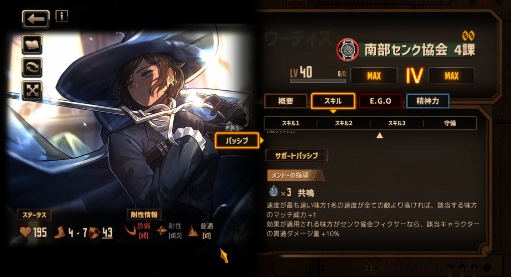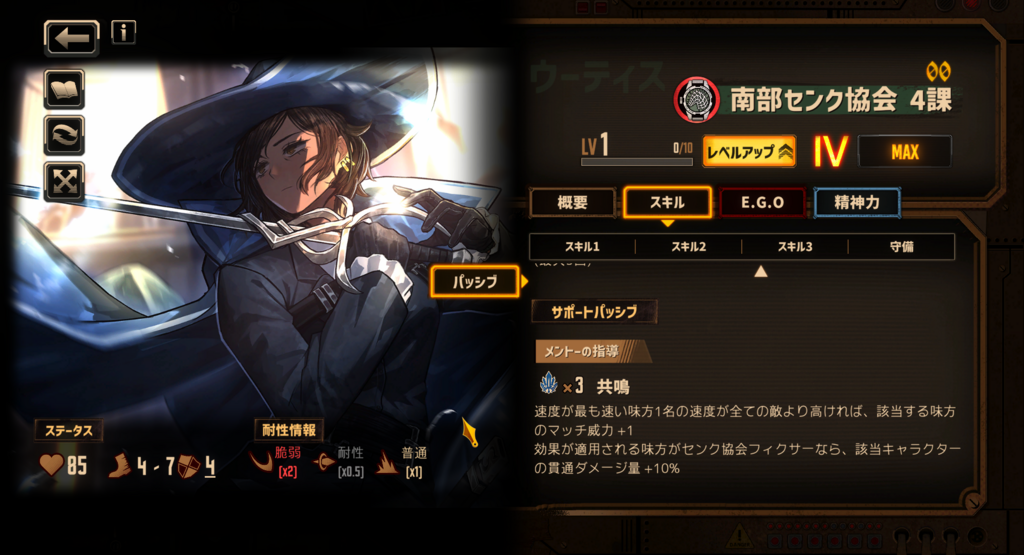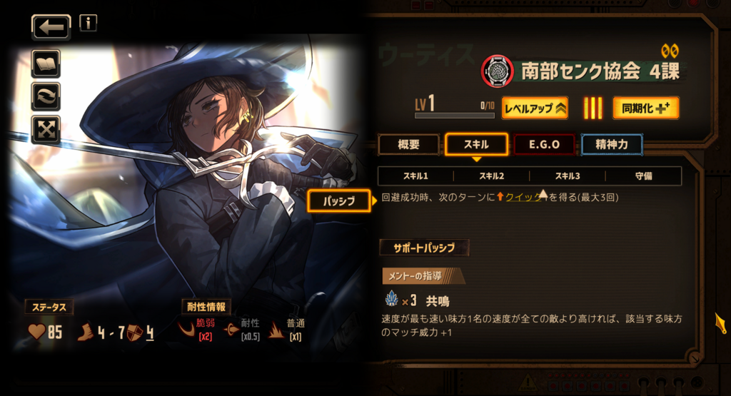 サポートパッシブは一番速い味方の速度がすべての敵より高い場合、該当する味方のマッチ威力+1というもの この効果は同期4で効果が一部強化され、該当者がセンク協会フィクサーだった場合そのキャラクターの貫通ダメージ量+10%が追加される ちなみに、今実装されているセンク協会フィクサーは全員全スキル貫通属性である