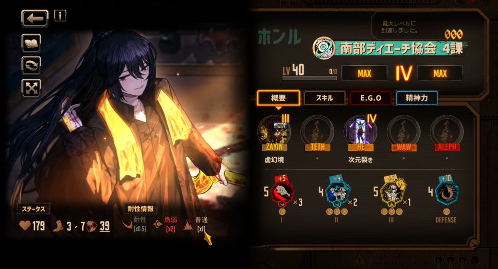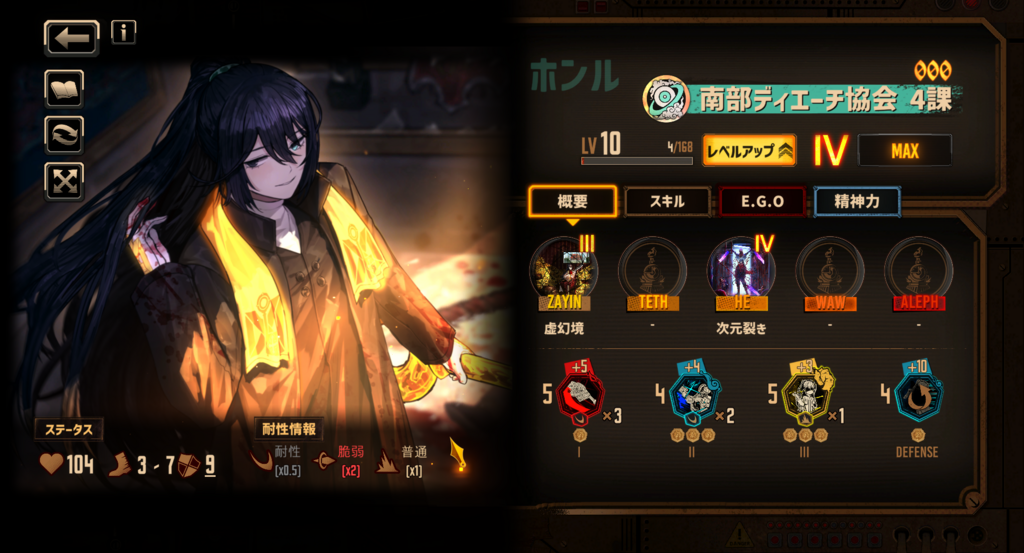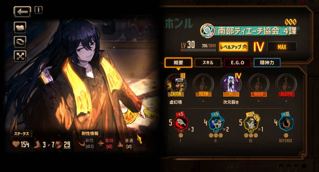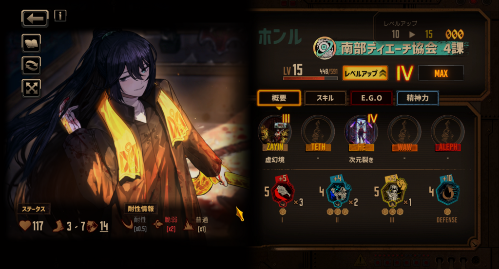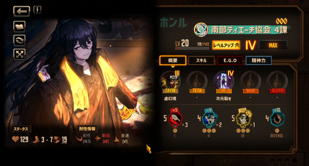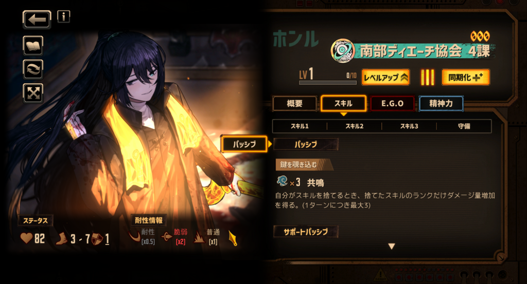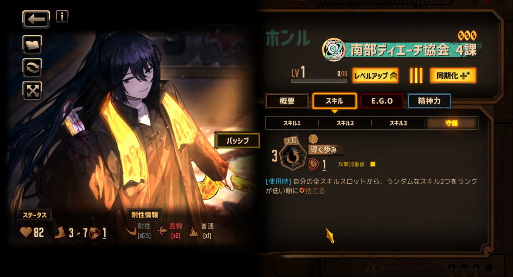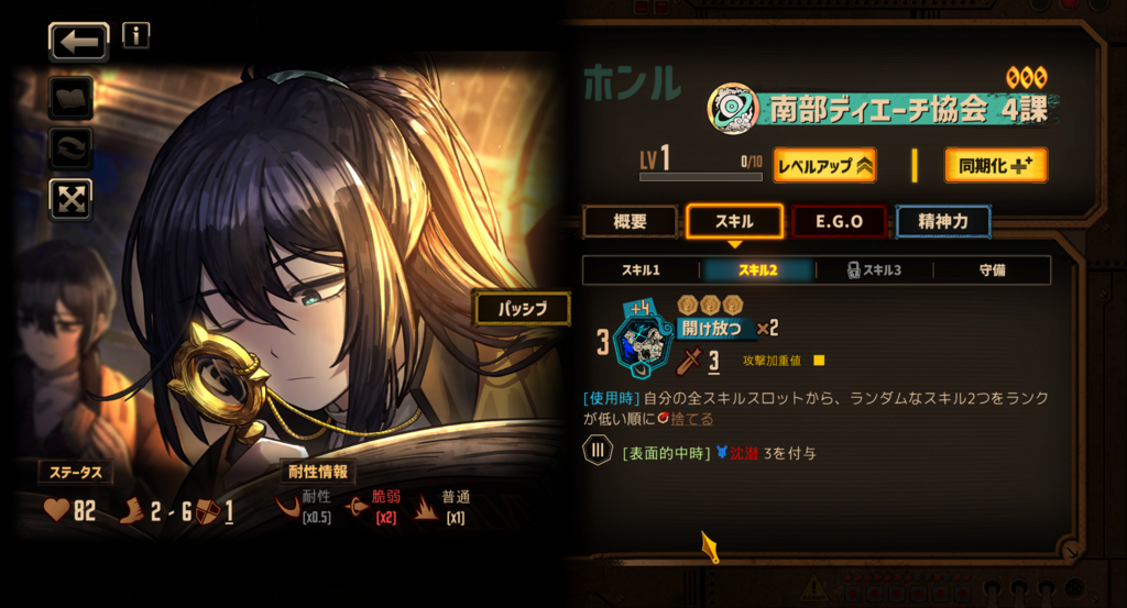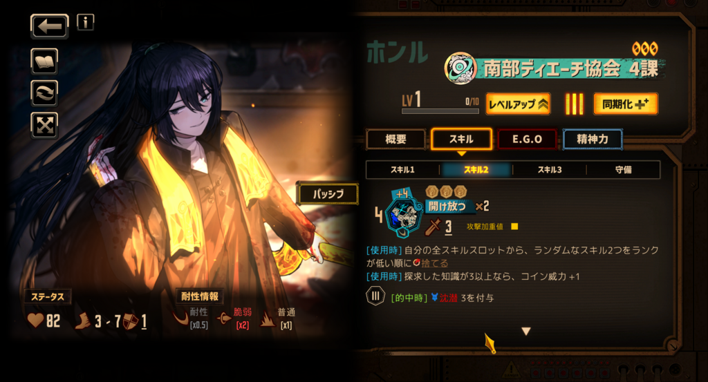 軽く運用してみた所感としては「雑に使っても十分強いし、考えて使うともっと強い」。 コイン枚数追加やコイン威力増加を意識せずに雑につないでもそこそこのマッチ威力と火力が出る。よく考えればスキル1もスキル2も、だいたい奥歯ウーティスと同じくらいなので当然といえば当然なのだが。 それに加えて知識に応じてさらにコイン枚数追加やコイン威力増加があるため、もうどうやっても強い。ポンるを押しのけて「ホンルで適当に強い人格No.1」になれるかというと議論の余地があるが、その土俵でポンると争うことができるというのはかなり強い人格なのではないだろうか。両方持っていても、十分使い分けできる強さである。 何よりの目玉は「マッチ威力も火力も高水準の沈潜人格」ということである。湖の鏡で追加された沈潜合成E.G.Oギフト、黒い楽譜。効果の発動条件が「沈潜を保有している人格が5人以上戦闘に参加」というものだが、実用的な沈潜人格は梅イサン、奥歯イシュ、ディエーチロージャの3人であった。ここに扱いが難しいで有名な狐雨ヒースを入れるとしても、あと1人足りない。☆2であるマリアッチシンクレアとG社ウーティスはマッチと火力が不安定で、ハードはかなりキツい。そうなると黒い楽譜を使った沈潜パは諦めるか、G社ウーティスを入れて無理やり使うという道しかなかった。しかし、ディエーチイサンが来たことで黒い楽譜の発動が現実的なものとなったのである。現環境最強と名高い血の霧出血パに届くほど強いわけではないが、黒い楽譜が使えるようになったことは沈潜パとしてはとても大きいものである。黒い楽譜に威力増加がついていたらマジで環境取ってた可能性はある 再三になるが、とにかくこの人格は「雑に使っても十分強いし、考えて使うともっと強い」という人格である。今引くのを迷ってる人、沈潜人格を十分持ってる人は引いておくべき人格だと思う。