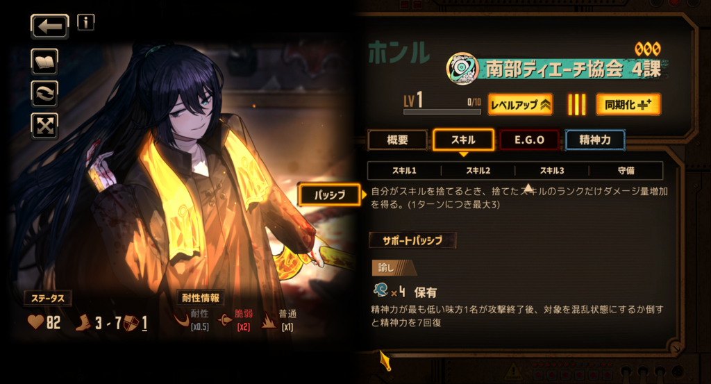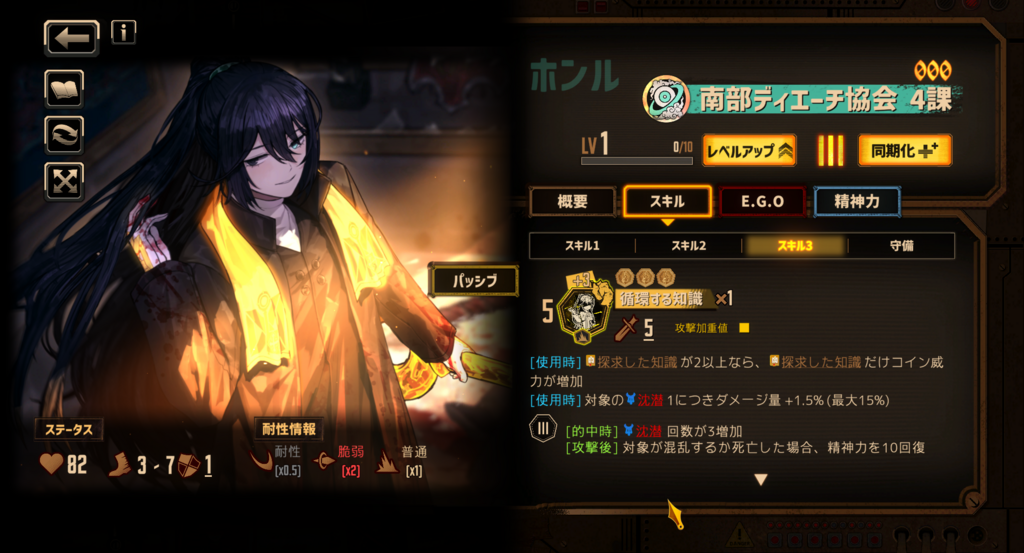 知識が上昇するタイミングは、ホンル自身のスキルを捨てた場合は戦闘開始時に上昇するのに対し、パッシブで知識が上昇するタイミングは次ターン頭の模様 またパッシブで上昇する値は1Tにつき1のみ?ちょっとわからないのでだれか検証してほしい 守備が捨てられないことさえ知っておけば、S3捨てれば常に3コイン威力20超えを全スキルでたたき出す暴力の鬼 怠惰は稼げないけど、イシュ盲目に必要な憤怒と憂鬱を稼げるのも◎