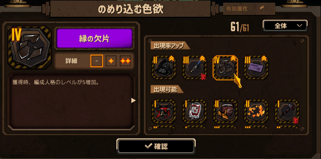 縁の欠片が現れる確率は低いですが、難易度ノーマルの2層目のテーマパック選択の報酬で現れたことがあります。もしかしたら1層目から現れるのかもしれませんが、いずれにしてもテーマパック報酬で普段通りにギフトを集めるのは諦めて縁の欠片が見つかるまでとにかく更新をかけ続けます。