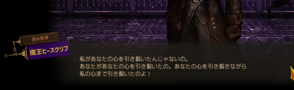 最初の魔王ヒースクリフ+ワイルドハントの所はしっかり強くて警戒しながら戦ってたけど、 キャサリンが出て来てからは急に圧が減って楽になって不思議な感覚だった。 過去に囚われたまま互いに調子を崩し合う二人……