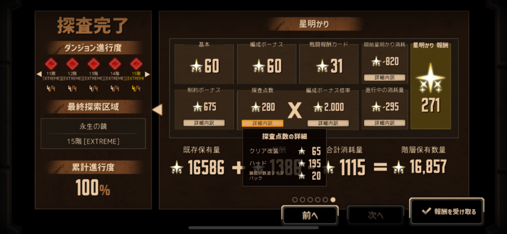 15層クリアで星明かり報酬いくらだっけ。 さっき加護++全部盛りでクリアして収支-200ぐらいだった覚えはある。