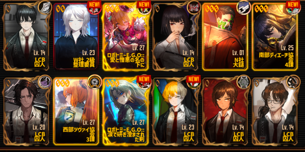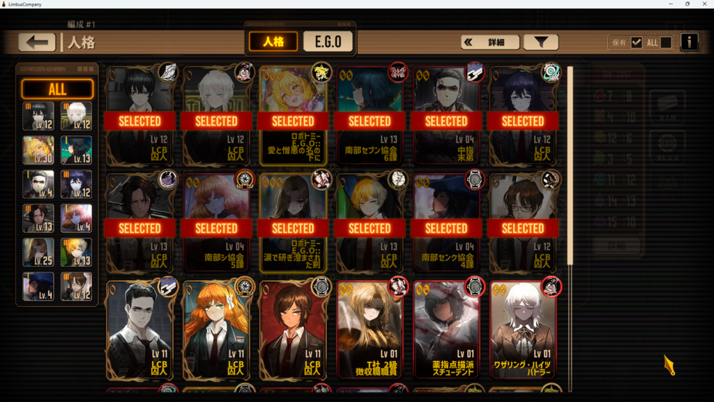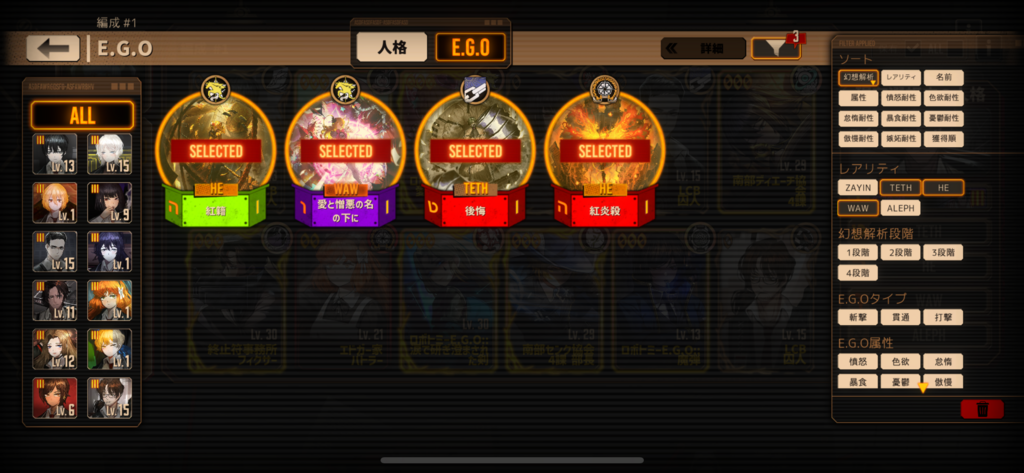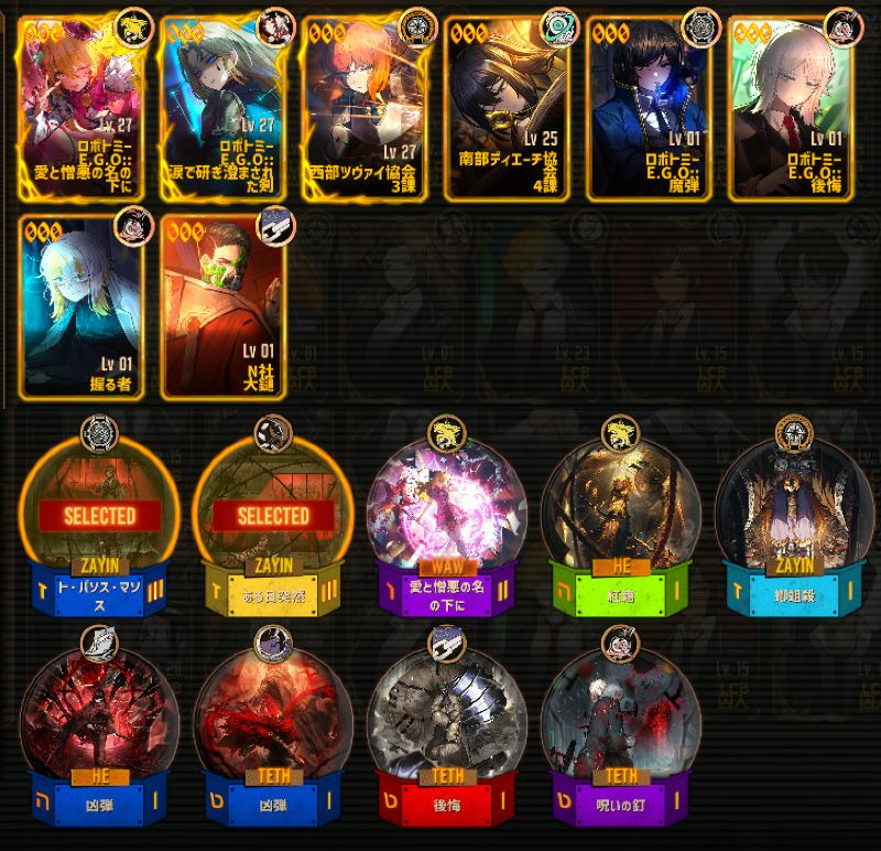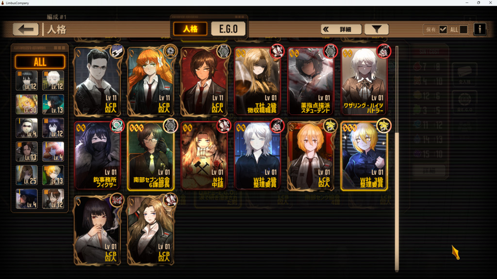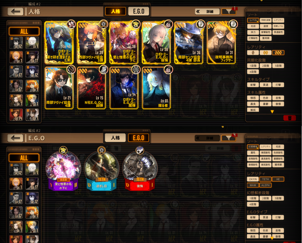 こんな感じだと思います!EGOは最初の方はさほど気にしなくて良いです。(ヴァルプル限定のEGOを3つも引けててすごい)人格以上に重視される必須級のものは水袋くらいですが、良秀とヒースの000を確保できた後など余裕があれば愛憎EGOの他に高加重値のものを持っていてもいいかもしれません。