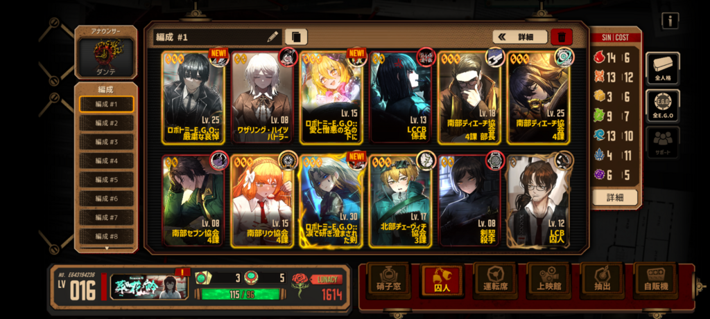 戦闘はある程度覚えましたが、現在の編成だと強そうな人格を適当に詰め込んだだけのグッドスタッフになってしまっています(愛と憎悪ドンキ、絶望ロージャ、西部イシュ、南部センクウーティス、W社ホンル)