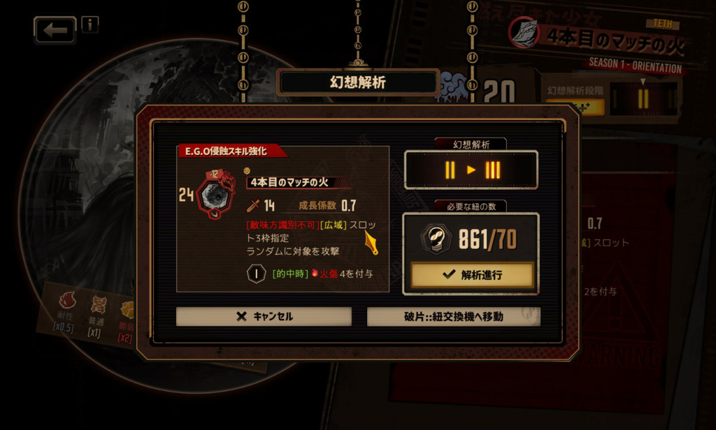 (なんだお前TETHの恥さらしか?)一応パッシブの発動契機が「マッチ勝利時」であるので憤怒を大量に積んで、敵の多コインスキルにマッチ勝利連打すれば一気に20以上の火傷を付与出来るポテンシャルはある。火傷回数持ちの人格のサポートを受けられれば、スキルそのものより火傷のスリップダメージで焼き殺すギミック破壊の化身になれる...かもしれない。(LoRでの幻想体「帰り道」をギミック無視で倒すアレ)1スキルで一回しか発動しないのでこの運用すらも不可。解析Ⅲで威力が上昇しないのがバグで、修正入ることを切に願うしかない。