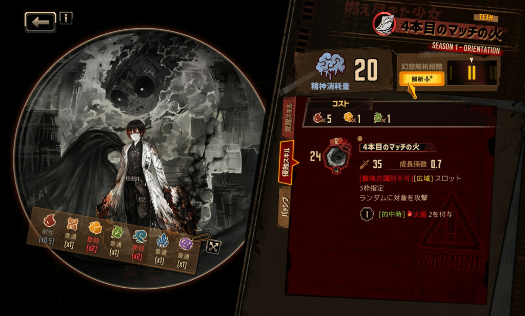 一応パッシブの発動契機が「マッチ勝利時」であるので憤怒を大量に積んで、敵の多コインスキルにマッチ勝利連打すれば一気に20以上の火傷を付与出来るポテンシャルはある。 火傷回数持ちの人格のサポートを受けられれば、スキルそのものより火傷のスリップダメージで焼き殺すギミック破壊の化身になれる...かもしれない。(LoRでの幻想体「帰り道」をギミック無視で倒すアレ) 1スキルで一回しか発動しないのでこの運用すらも不可。解析Ⅲで威力が上昇しないのがバグで、修正入ることを切に願うしかない。