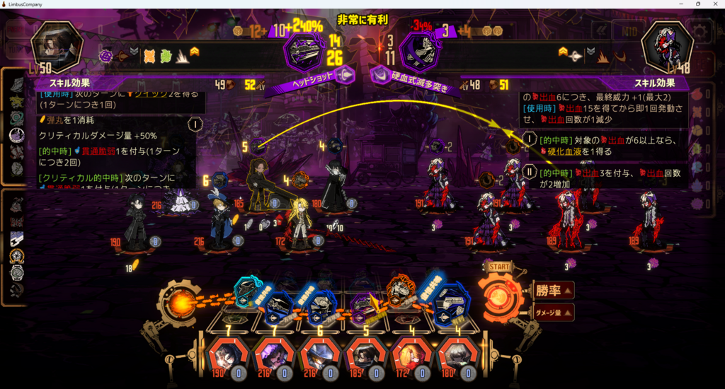 初ターンはスキル1使うのも悪くないノムよ 理由は色々あるけど、「呼吸回数の獲得にはスキル1が一番適する」「スキル2は精神力や呼吸が足りないとしょっぱい」「一方、3コイン全てで貫通威力増加3を受け取ったスキル1の火力はかなり高い」といった事が言えるノム