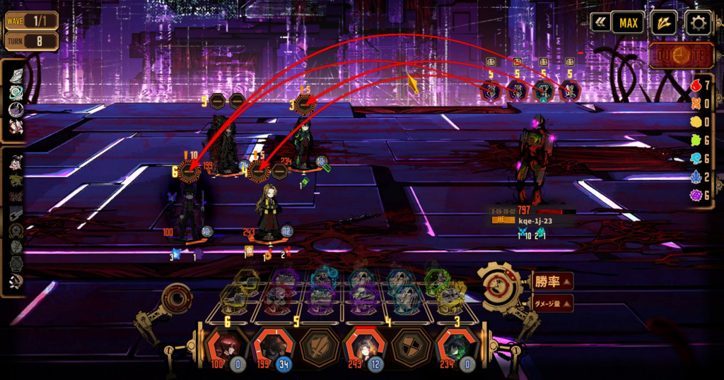 上記の場合は2T目まで生存していたイサンのスロット1枠だけ減って5枠まで増えますね 2T目に退場すれば5T目までは完全な単騎運用とスロット数は変りませんし、 狐相手であれば大体終わっていますが、6T目以降も5枠もあれば十分なところもあるのでなかなかいい感じでした