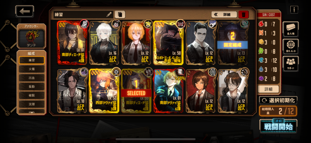 ムルソー、イサンいますが育成全くしておらず使えません。(かといって今から1Lvから上げるのもキツすぎる) 雑魚倒すとこまでは全然上手くいくのに、残り2人になった時にどうしても毎ターン1人か2人混乱してて何もできん泣 パッシブ、スキル見ても毎回新しい単語出るからどれがどれなのかわからなくなるし、攻略見てもその通りにマッチ勝てなくて詰むし……。 このゲーム向いてないかもしれない。 アクナイコラボの為に半年頑張ってきたけど、25日までに8章クリアできる気がしない……。 やっとレイホン乗り越えたのに泣