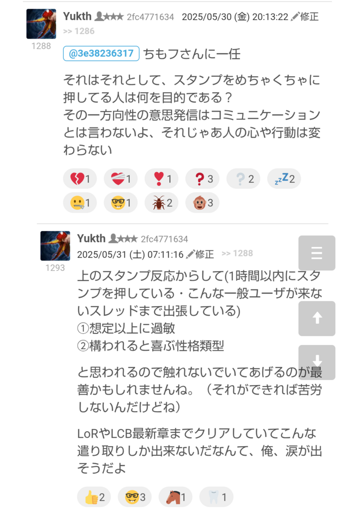 ページ更新したら1分くらいで>> 513に👍スタンプが、>> 525に🤔スタンプが5個くらい連投されてて怖い 平日の昼間なんですけどね 自分からヤバさを証明しなくていいから...