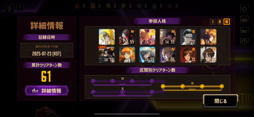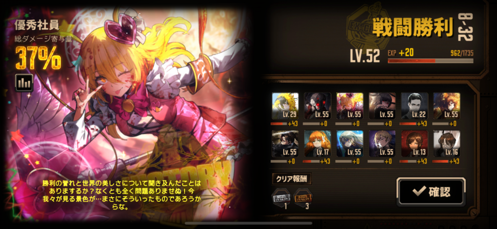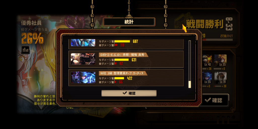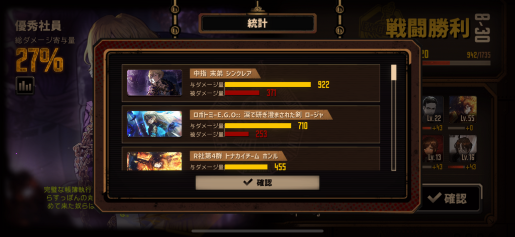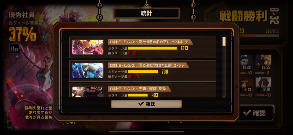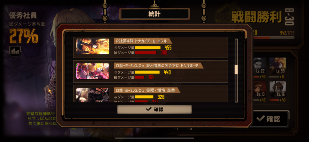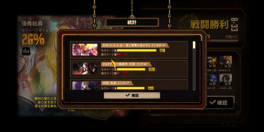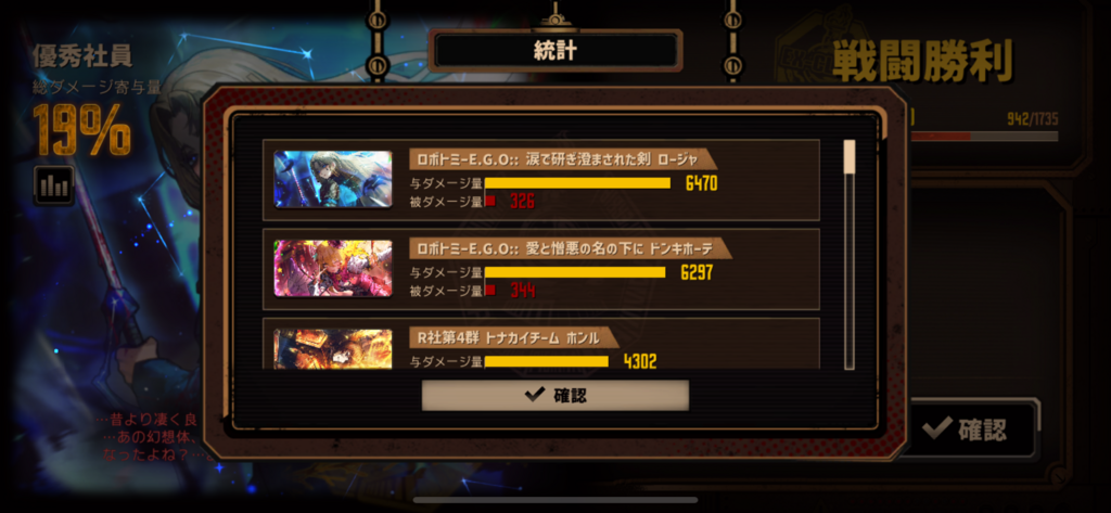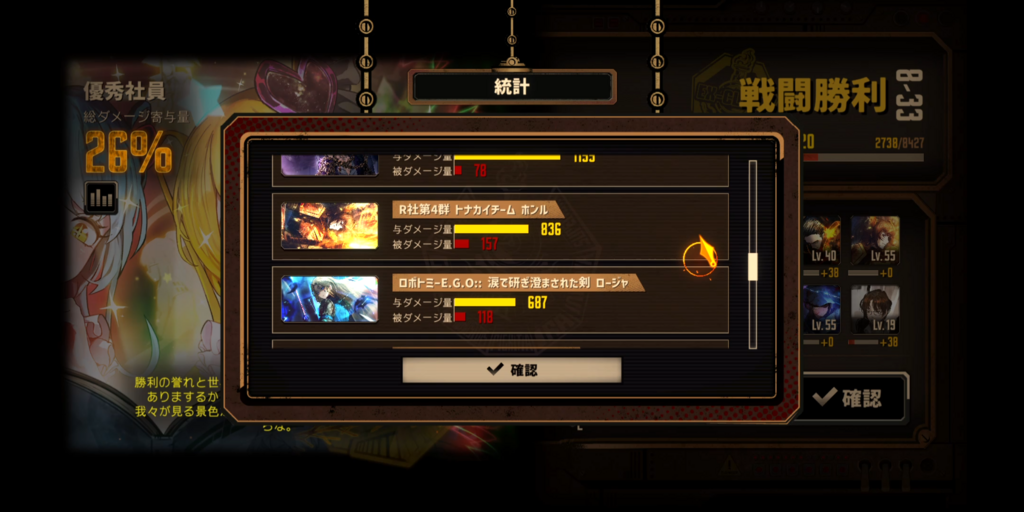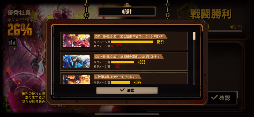 逆に他の戦闘については、喜怒哀楽はロージャが加護運用でそもそも火力が出ない運用、他キャラもそこまで火力が出るわけでもない中指人格やマルクラメインなのでこの程度火力で突出するのはさほど違和感は無いと思います。レイホンもそもそも火力が出ないという結果なので概ね納得の行く結果です。