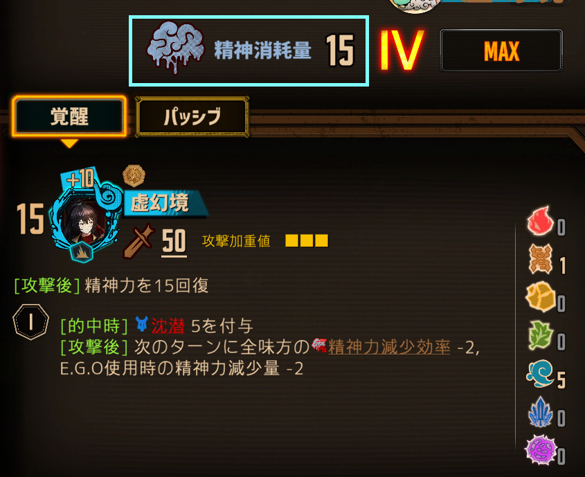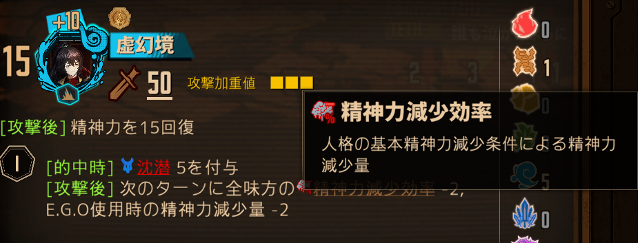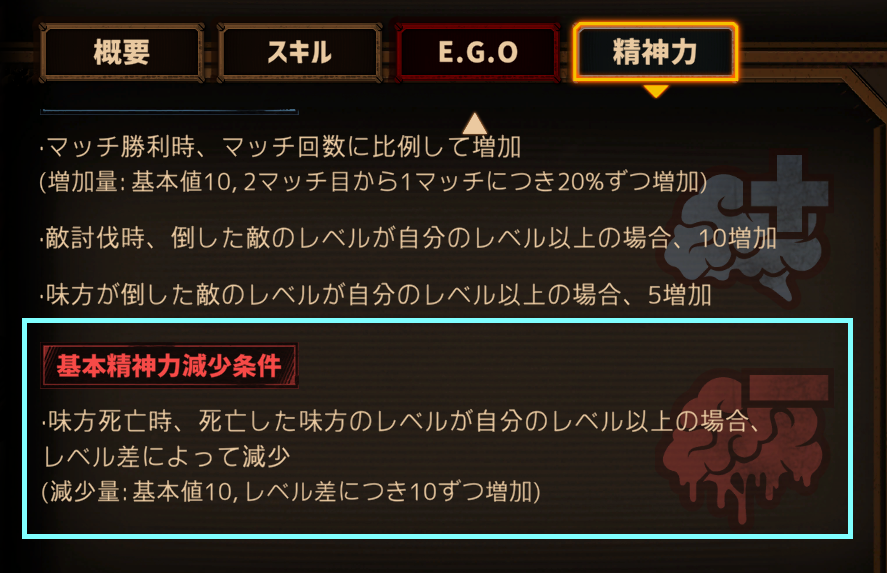 ちなみに精神力減少効率はゲーム中で説明を見れますが、 E.G.O使用時の精神力効率減少は見れません。