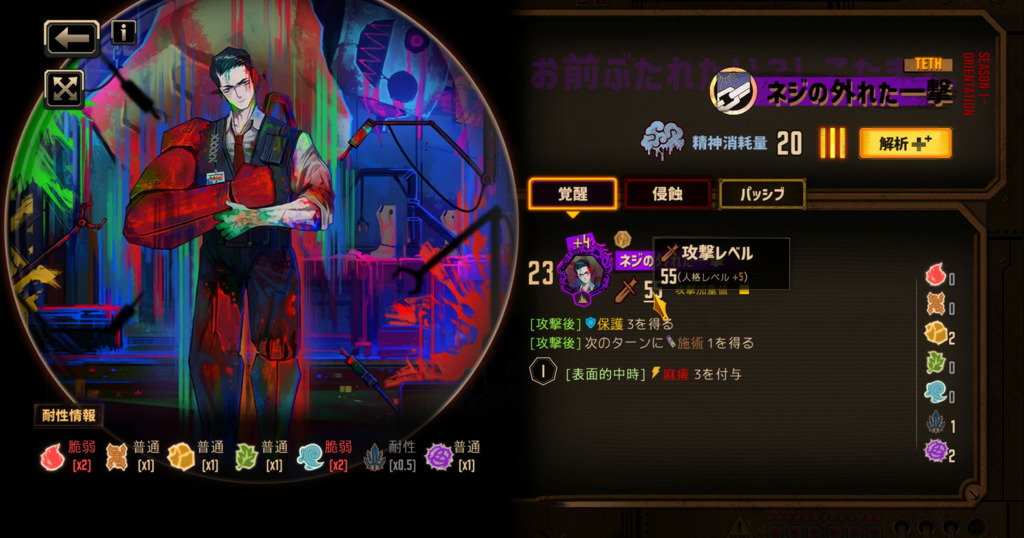 耐久に優れた人格が多いムルソーのHPが25%を切るような戦況はどうせ他も壊滅してて負け濃厚だろうから…と開き直ってる。もちろんいつかは事故る日が来るとは思うけど。 そもそも解析Lv3完了後のこいつが攻撃レベル41、最低マッチ威力23というシーズン1時点では屈指のマッチ強者かつ火力EGOで、基本的にはタンク役になるムルソーが持つサブのダメージ源として優秀だと思うんだよね。そういう意味でも紐に余裕があるなら解析をオススメしたい。(個人の意見です)