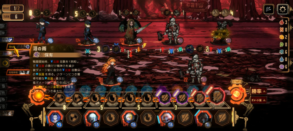 SS一、二枚目は沈潜13/1を付与されたヒースクリフ(精神力0)がノーダメージで一ターン経過し、精神力-3になったところ。