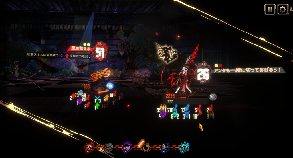 あ、これパッシブ「死線足掻き」の「呼吸+1」って、回数を得るだけのスキルでも威力貰えるんですね。気付いてませんでした。