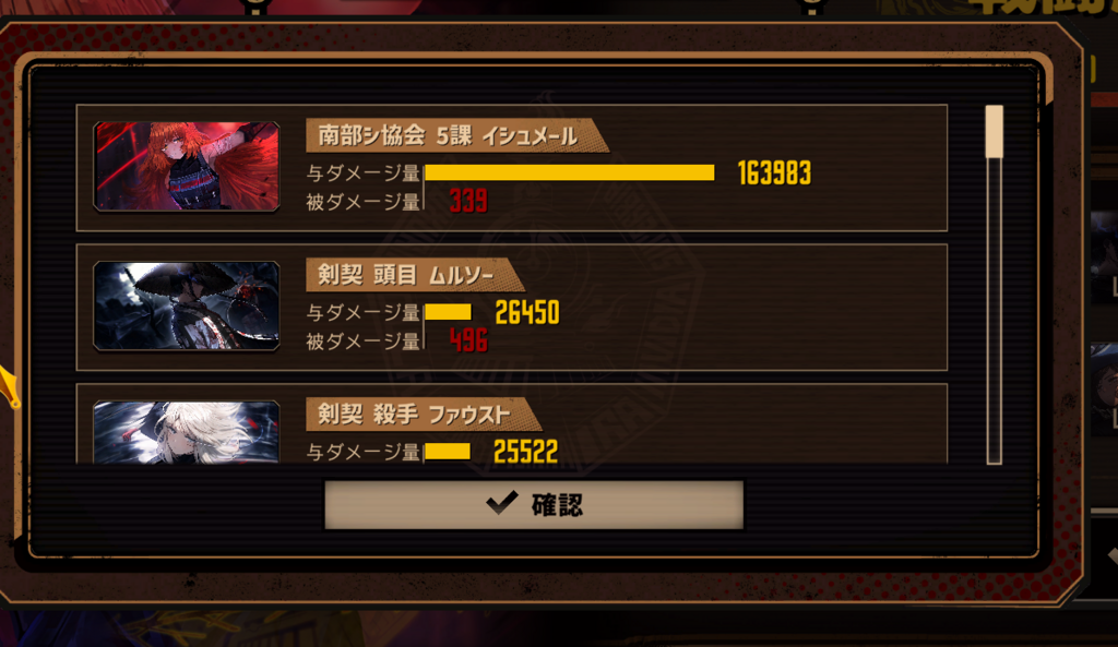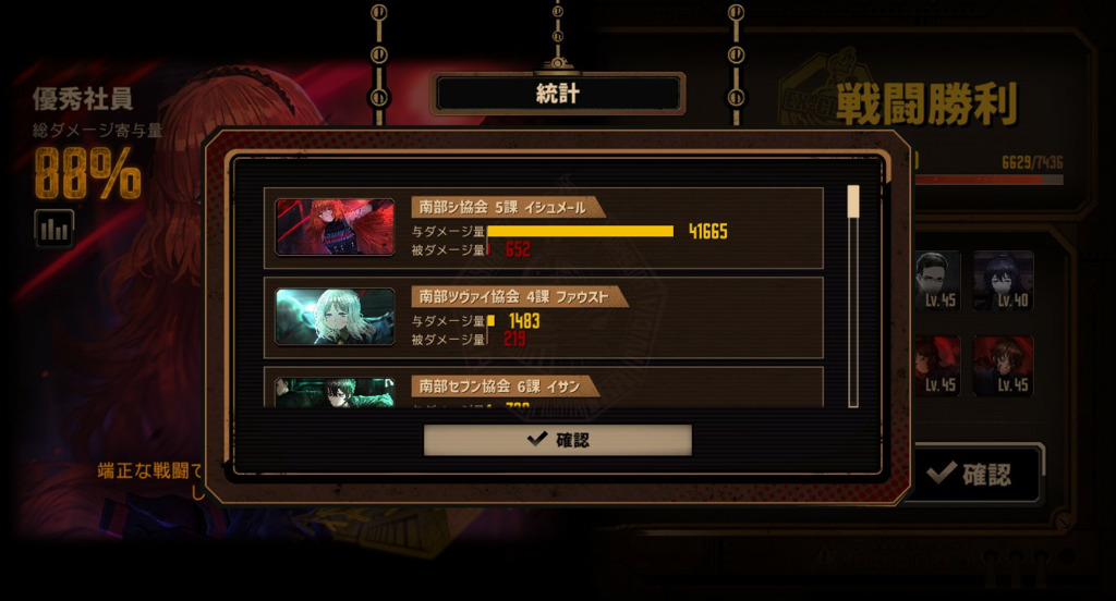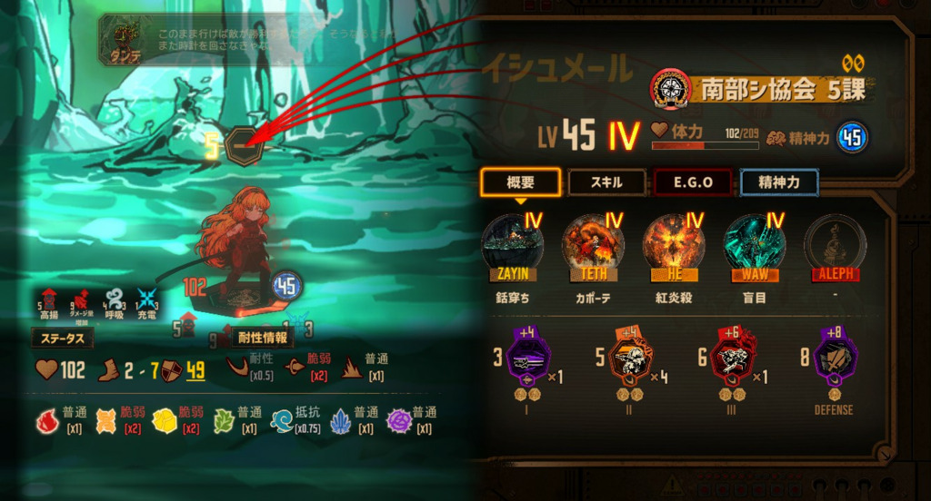 決意++(75%カット)と、サポートにLCB囚人ムルソー(10%カット)、ツヴァイ協会シンクレア(10%カット)を置くと、 ダメージが95%カットになっているのか殆どダメージを1に抑える 追加でG社グレゴールをサポートに置けば、単騎でも死とは無縁になる