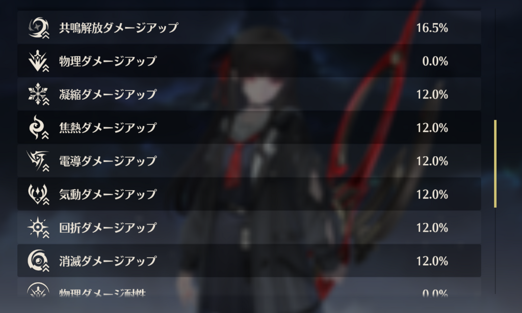 あとついでに言うと、敵に出すダメージは ・どの攻撃の何段目を当てたのか ・クリティカルの発生の有無 ・防御補正(敵とのレベル差) ・敵の属性耐性 ・装備している音骸ハーモニー効果 ・自己バフの有無 とかでいくらでも変わるからダメージ値を気にするよりステータスを気にした方が良いって話