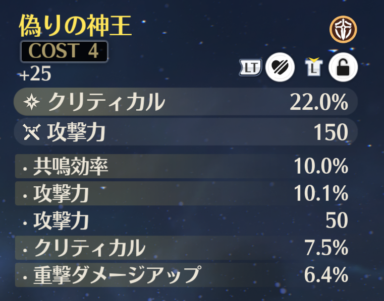 完凸餅武器ありの43311で4コス音骸クリ率。 【万民の願い、栄光の冠】常時4スタックかかったままでクリ169%までいくから、サブステ厳選次第では175ギリ届くか届かないくらいになりそうだ。