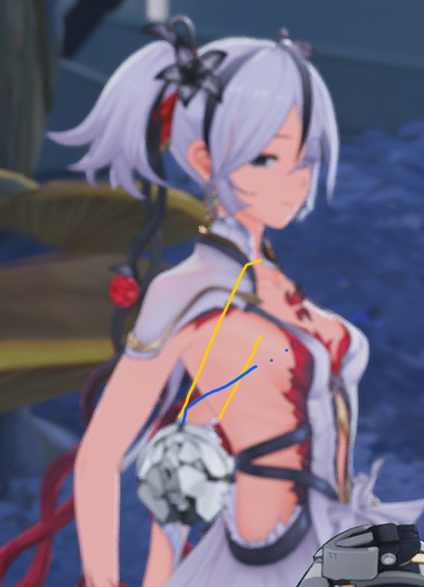 木主です。黄色い線の方で見えてます、画像の下に左手首あたりが写っていますし。そのうえで、思いっきり胸を張って無理に腕を後ろにもっていってる感じに見えてます。これを振り向きざまにやってたとしても右腕は百歩譲ってそれでいいとして、左腕がそこにあると無理しないと見えなんじゃないかなと、あくまでも自分は思ってます。ツバキの体が柔らかいか、あえて見せに行ってる可愛いやつって脳内補正しないと変に見えてるんだよね自分はね。雑な絵だけど、どう見えてるかの画像も載せておきます。まぁ自分が間違いならそれならそれで全然いいです、気軽な雑談なんで。