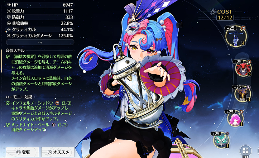 ステータス画面ではインフェルノの重撃クリ率が乗ってるかは確認できないけど、3凸効果+ハーモニー効果合わせて率100%以上になるようにして塔や廃墟で何回も戦ってみたけどジャンプのクリは外れることはなかった。ただ当然のことながら沈日から変える場合は計30%のバフを犠牲にクリ率を上げることになるからダメージは下がった。