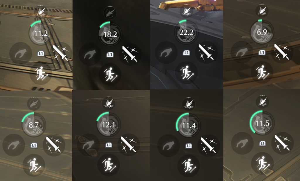 画像上段左から:スキル短押し3Hit/スキル長押し5Hit/スキル2Hit/スキル1Hit