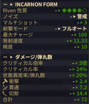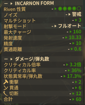 PRIME版のINCARNON FORM後ステータス。クリティカル関連が挙がってマルチもデフォルトで3になったけど、1発当たりの威力と精度が下がった。 精度低下が結構痛くて40mぐらい先の敵にはスコープ覗かないとほぼ当たらない。スコープ覗いても結構散る。
