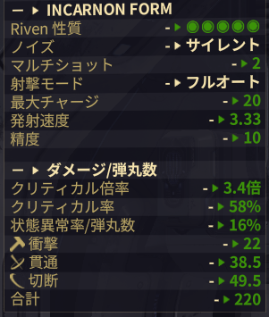 結論としては、ロマンはあるけど強くはないです。 (超クリ特化型ビルドと高いriven性質数値、アルケインでHS超強化からのHS倍率強化が合わさり、『1撃の威力だけは』ほかのインカーノン武器よりも優れてはいます。)