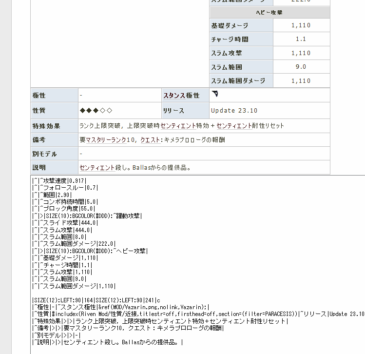 説明する際に意味が通じる言葉選びをする気配も無いですし、読み手が何を求めてるかの違いで見出しからその部分にすぐに飛べるように使用目的別に見出しで分かると言うこともほとんど無く、概要にすべて長文で書かれていたり、何の意味があるのか分からない分け方になっていたり。例えば武器のページなら、性能値の数値一覧だけ見たい人、入手方法だけ知りたい人、実際に使ってみるとどんな動きをする武器なのかを知りたい人。などなど、読み手によってまったく必要としない情報を長々と読ませない工夫ができますよね。見出しや項目で分ける意味はそこにあります。それを意識しないのであれば分けてあっても分けてないのと同じです。
