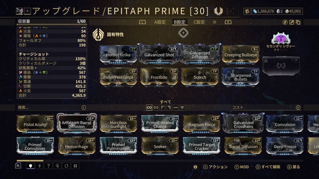 Epitaphはノンチャ、チャージ関わらず直撃ダメージにはガルバshotやセカンダリシヴァーといったCO系が乗算で乗るから基礎ダメ盛っておくとその部分がかなり伸びるんだよね。感染と衝撃付与で切断発生mod組んだ上でRoarや状態異常ダメージ増加modとあわせるとチャージショットの切断Dotで鋼デモリッシャー相手でもヘルスをゴリゴリ削ってくれる