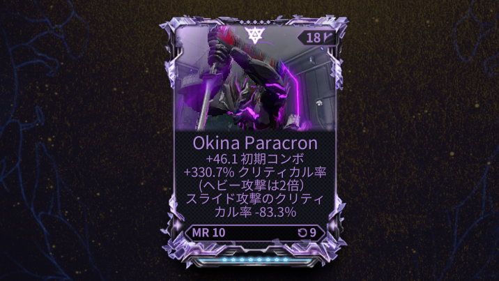4番増強+1番増強を両方盛ることで1番が勝手に飛んで敵を4番状態にしてダメージを2倍化くれる。グレンデルを移植することで感染付与性能もつけることで、武器外で火炎・感染・爆発の3属性の高スタックを得られる。okina自身をガス電気で組めば近接攻撃部分でガス・電気が、氷ダガーの属性がガス・磁力(もともとの冷気ダガーの属性が恐らく冷気単)・冷気(冷気10スタックは固定付与)となり、7種類のエレメンタルと3種類の物理属性の計10属性分のCO強化が狙えるという。