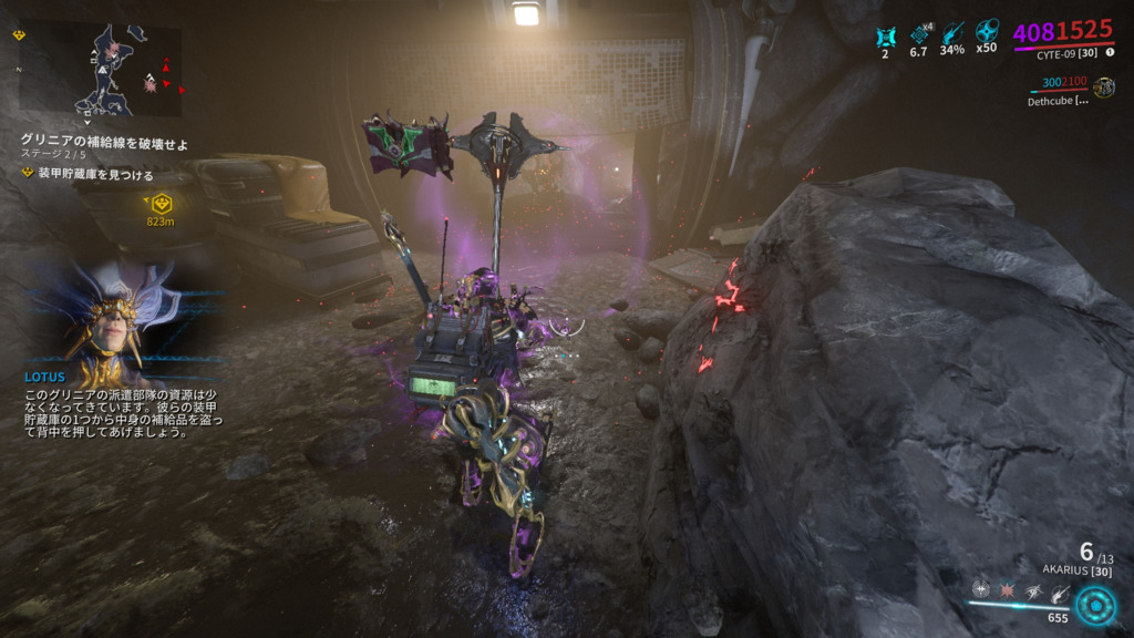 一方Cyte-09を着たテンノは透明化せず、可視化させず、爆破武器を持って2番を全部自分で使いながら全てを破壊していた