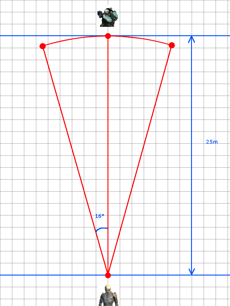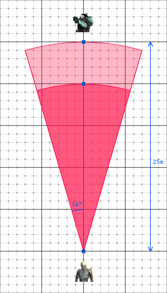 気になったので調べてみたところ、その通りになっていました。視覚的には以下の画像のようになっており、Firestorm(爆発範囲)は薄いピンクの領域の奥ゆき、Sinister Reach(射程距離)は濃いピンクの領域の奥ゆきを向上させます。角度を16°以上に増やす方法はありませんでした。貫通については調べていません。後方の範囲も調べていません。