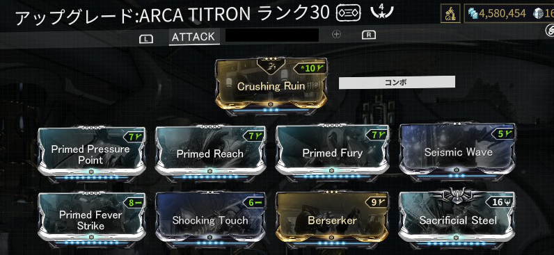 riven無しのスラム連発ビルドの例。潜るレベル帯にも依るけど、実践は軽装甲の敵が多いので、ガード攻撃でスタック非消費スラムを打っていれば、自然とスタック10になるよ。
