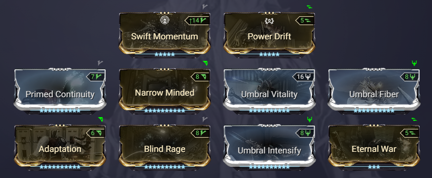 アンブラで増えた装甲がバッテリーでエネルギーになり、ヘルスがベリコーズで威力になる。エネルギー困らないからバッテリーはいらない気もするけど、エネ1200という数値が気持ちいい(頭グリニア)