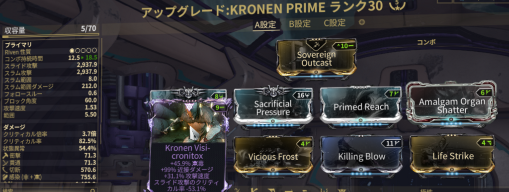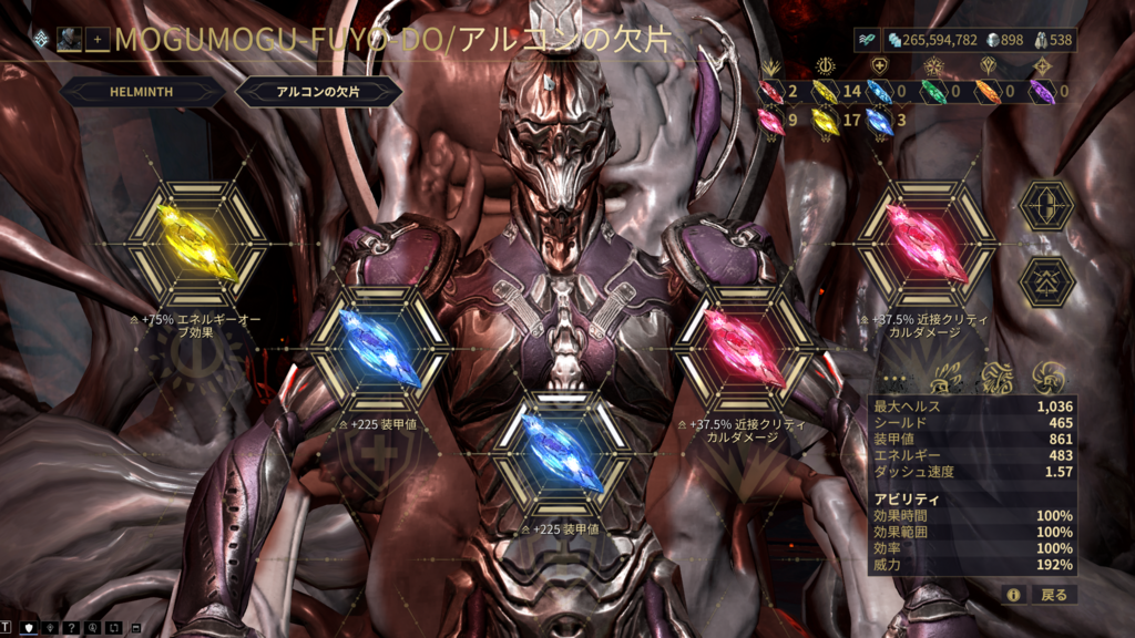 まだ雑な計算しかしてないのだけど、装甲100程度の豆腐レーム達の生存・耐久力伸ばす方法的に興味あったから、装甲によるダメージ軽減とヘルスに対するダメージ割合で計算してみたところ、下手に装甲盛るよりヘルス割合を増やした方がダメージ/ヘルス割合的には良いみたい。もともとが低装甲のぶん基礎装甲MODの影響力が少なくなるから、装甲はコストが大きいけどUmbMOD3セットで192.5%アップか、固定値加算の蒼天欠片で+150(225)、確率だけどガーディアンの+900、条件厳しいけどヘルコンの+450×3が効果高いかしら。ただ、アルケインやヘルコンは条件的に安定させ辛いのが難点な気がするわ。UmbMOD3載せはコストが重いけど、ヘルスも770伸びるし、多少欲しい威力も伸びるし… 試しということでUmbフォーマ挿したところだけど、枠がきつくて範囲・効率関係は諦めたわ…オーラCD、PSF、PCon、PFlo、Umb3種、アダプテ、4増であと1枠にヘルス関係かその他で、アルケイングレイスで回復、エナジャイと琥珀欠片でエネルギーをなんとかできればいいなぁ…非常時は4番、それ以外は3番か1番かけつつ(どっちがいいのかしら)2番剥がしでお掃除できるといいわね…ネメシスちゃん………(まだ試してないけど)