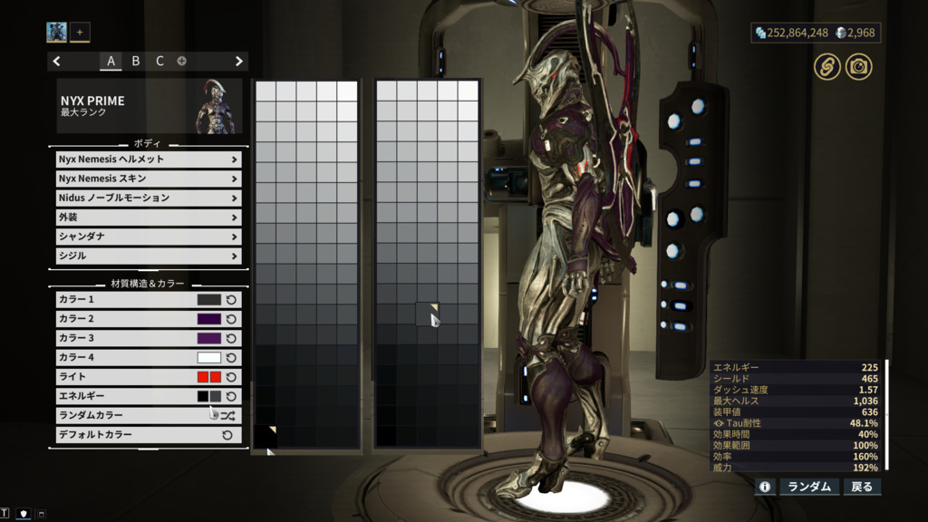 エネルギーカラー1を真っ黒、カラー2を暗めの灰色とかするとエイム中が格段に見易くなりますので良かったらお試し下さい。画像1画像2 Amarセットビルド組む時に眩しくて困ったのでこれに調整しましたね。