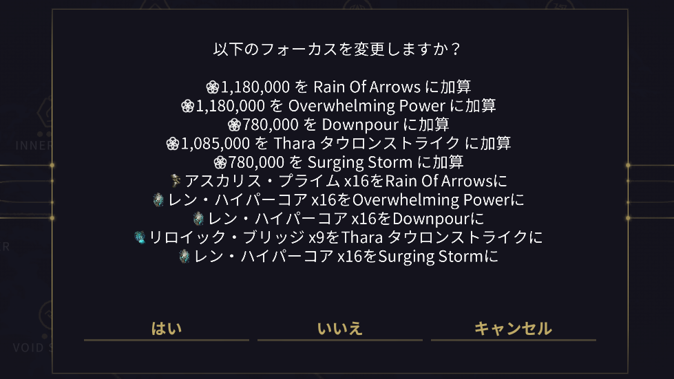 MADURAIの強化に要求される追加コストはリロイック・ブリッジx16、アスカリス・プライムx9、レン・ハイパーコアx48。Naramonと比べて数の増減はないのでフォーカス毎に要求が違うという事はなさそうかな