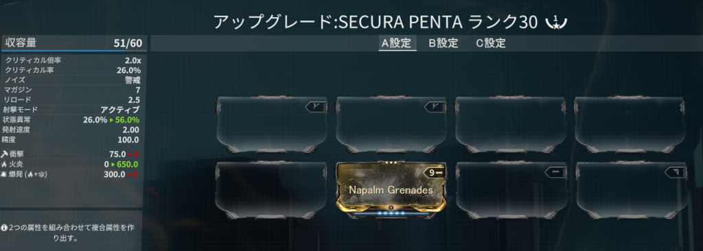 バグなのか仕様なのか、Secura PentaにNapakm Grenadesを入れても状態異常が14%しか増えない。