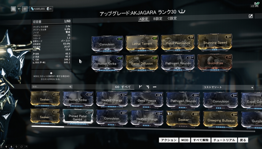 3-1のRivenでクリ率90%まで確保出来るってのはだいぶ出世したね。あと殆ど見切れてるけど、フォントの形的にリロードは1.1秒に見える。これは使い勝手が良さそうだ