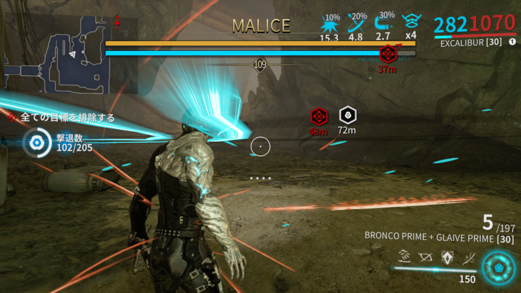 KUVA沼活動中なのでパッチ後MALICEサンとは何度も会っているのですが自殺した覚えがないと思いつつ検証しにいきましたところ、体中をギュンギュン旋回しますが自分には攻撃判定が無く、そのまま突撃するとMALICEサンがダメージを受けますので安全でした。良心的であります。いつものようにローリングしてMagnetizeを剥がしてから投げれば解決です。床に落ちたMagnetize球体に投げ込むと中で2秒弱暴れた後問題無く戻ってきます。