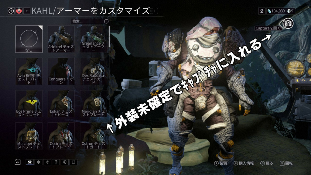 フレームや中ンチョの外装を弄っている際には隠れてしまうcapturaのボタンですが、Kahl君の場合装備変更後確定しなくても入れてしまいます。シーン読み込みに装備未確定なグリニア兵が混じり込んでしまい、switch程度のハードではキャパ越えしてしまった結果が融合バグなのでは?と考えています。DEサンがなぜコレに気付かないのかコレガワカラナイ