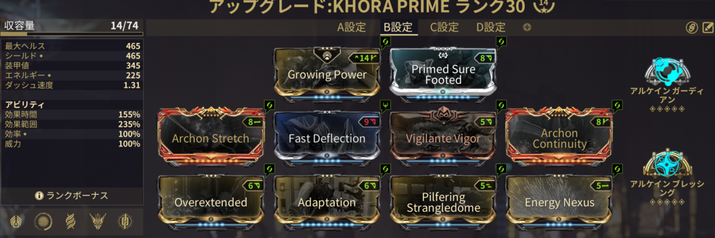 武器がちゃんとバフなしでも鋼行けるぐらい育ってる前提にはなるけど、普通にこれで行けるで このKhoraはA設定を鋼亀裂カスケ用で使ってるから、アルコン欠片は全部Tauだけどリジェネ用の蒼天1にアビ威力で真紅4 アビ威力が地味にVenariの存命中効果で本体の足の速さに直結するからそうしてるだけで、1番ムチはそもそも武器で爆殺する関係上アビ武器化してからも全く使ってない もしそれでもENが足りないのなら、アルコン欠片を一つ紫紺にしてヘルスオーブでもEN回復するようにすればだいぶ楽になるんじゃないかな