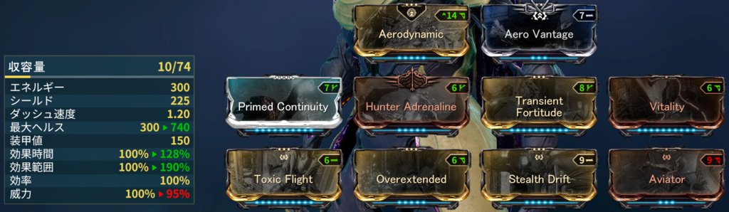 前回の続きでビルドなど載せます。(※Aeroセットについては雑魚敵は何度も効きますが、ボス級の敵や分裂のデモリストには1度しか効きません。なのでソレ目的の場合は素直に別の武器やオペレーターで代用しましょう)。ToxicFlightについてはバレジャン時のダメージとエイムグライド時間に影響しますが、このダメージタイプについてはお好みで良いと思います。HandSpringを入れた理由として緊急時の吹き飛ばしやノックダウン対策です。エイムグライド中のみステルス維持ができるのでダウン中は丸腰になるのでそれを考慮した対策です。後効果時間と範囲を今回上げていますが、実際その辺り運用次第だと思います。例えば効果範囲と威力を上げて生存率の向上を図ったりなども勿論良いと思います。ステルスといってもやはり大ダメージを受ける危険はあるので。それとエイムグライドMODとこのAerodynamicの併用で浮遊時間が10秒近く維持できます。ちょっと長くなったので実際の動きなどは別の機会に載せます。(※補足ですがAerodynamicとAeroセットは別物です)。表記にはありませんが滞空ダメージカットは76%あります。トリニティいらずですね。