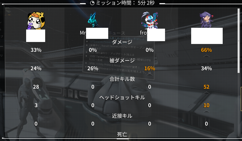 「離脱されない装備」に関しては人それぞれだしこのゲームでそれを気にしてたらキリがないので根気が大切。ただし失敗してすぐに受けなおすと同じメンツがそろって同じように失敗することが多いので1分でも時間を置くといいと思う。個人的なオススメはイナロスなどの耐久力の高いフレームや味方へのバフを持つもの。なるべく敵の足止めはしないように気を付けよう