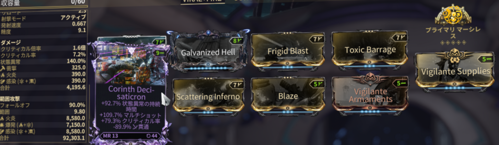 セカンダリの基礎2200をベースにしたDOTが強そうかと思い、妥協RIVENのマルチ盛り炎DOT延長バージョンで運用していますが、1発撃って放置で鋼グリニアが燃え尽きますので悪くはありませんでした。ZARRやBRAMMAには流石に敵いませんが、エフェクトが控え目で分隊員の視界を阻害しないのは大事なポイントですね。画像1