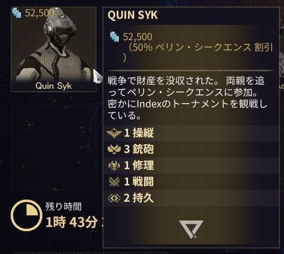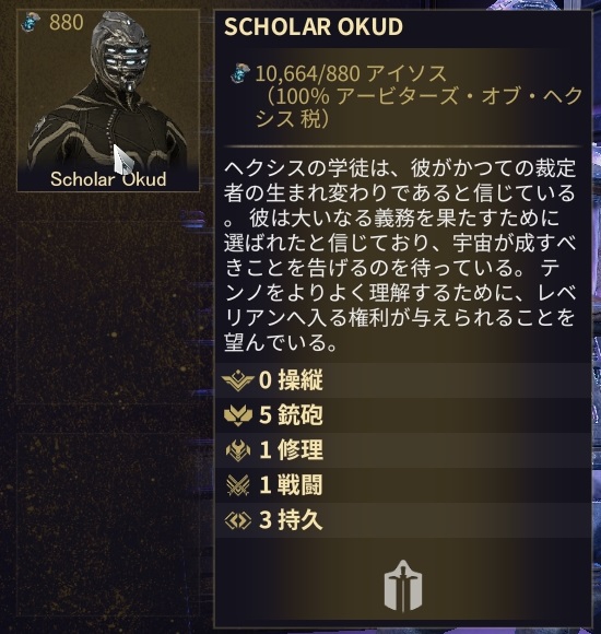 ただ自分はヘクシス・スーダのランクが-2、それ以外の4シンジケートのランクが5で、ヘクシスクルーの契機に内容的にもシンジケートとの関係が悪いからこそ見れる経歴でも不思議ではない経歴の(表には自分が追加したので・一般ボーイさんが直接は見た事が無いと思われる)「星系を粛正する戦いに倦み疲れ始めた。」があり、「人物像の偏りにシンジケートとの関係が関わって来たりしないのか」という部分が気になってます。