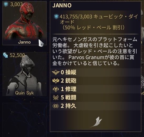 各シンジケートのクルーメイトの人物像を更新しました。 たぶん不足があるので、新しいのを見かけたら教えてください。 アップデート30でほぼ全面改訂になっており、それより前に契約していたクルーメイトの内容も書き換わってます。 またアップデート30からは組み合わせが固定になってます。そのうちランダムに戻るのかもしれませんが。 以前の内容と比べてなんで変更したのかよくわかりませが、新しいほうがよりそれらしい内容ということでしょうか。