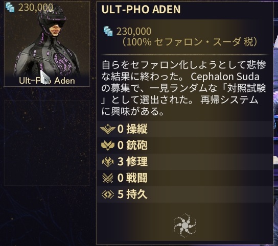 防護なしで集合体にアクセスしようとしてシナプス損傷に悩まされている。Cephalon Sudaジュニア情報スカウトから工作員に電撃出世し、改造も施す。放棄された構造体を探検したいと熱望する。