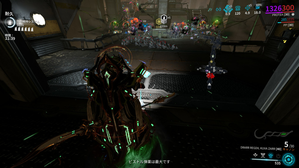 範囲145であれば立ち位置はここより少し前ぐらいで丁度良く敵を纏められます。GABII以外にもグリニアシップノードの感染体耐久であれば同じ手段が取れます。PSFとFURAXは無しでも何とかなりましたね・・・。5分で1000~1300キルぐらいは軽いし、撃ってた柱にくっつきに行くだけでカプセルもアイテムも全回収出来るのでとにかく楽です。Kuva Zarrであればのんびり10秒に一回くらい撃ってリロードの度に酸素回収してればまず酸素切れと無縁です。オマケにアコライト=サンも何故か目の前に沸いてくれるので、とにかく動く必要がありません。邪道も邪道の半放置技なので、いずれ何かしらで対策されそうですが・・・。